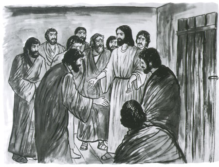 فِيمَا الرُسُلُ يَتَكَلَّمُونَ بِهذَا، وَقَفَ يَسُوعُ في وَسَطِهِم، وقَالَ لَهُم: أَلسَّلامُ لَكُم